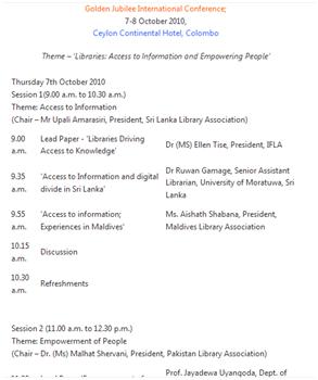 At the invitation of Sri Lanka Library Association (SLLA), the President of MLA, Aishath Shabana (Shaba), is attending the SLLA International Conference held to mark SLLA’s 50th Anniversary. The Conference is scheduled to be held in Colombo from 7th to 8th October 2010.