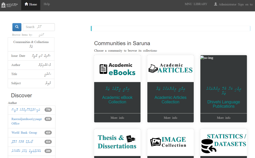 The first local digital repository developed by the Maldives National University Library, “Saruna” is an excellent source about Maldives. The repository has both contents about the Maldives, and contents written by Maldivians (which may not be related to Maldives). The materials available via Saruna can be read by children and adults, teachers and students, parents and grandparents. The materials are freely available to read and/or download.