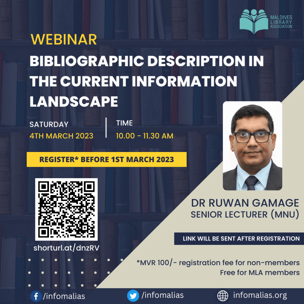 The resource person for the Webinar is Dr. Ruwan Gamage, Senior Lecturer of MNU. The webinar is free for MLA members but a fee of MVR 100/- will be charged for non-members.