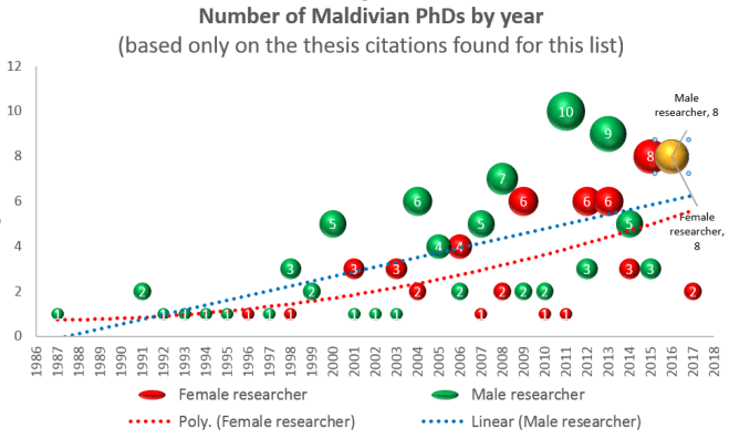 The gender representation of researchers is something that fascinates me and I had to convert the into statistics. Looking at the PhD research output represented graphically at the top of this page, the first Maldivian male to do his research was in 1987 while the first Maldivian female researcher gained a PhD. almost a decade later, in 1996. From 1987 onward there has been a steady number of men completing their PhD, while the second Maldivian woman achieved a Ph.D. qualification in 2001. As of 2016 (based on the citations collected here), there were 96 male researchers and 62 female researchers with a PhD qualification. Looking at the polynomial trend-line, it can be inferred that Maldivian women researchers perhaps could make up for the lost time in the near future and have equal representation in comparison to their male counterparts.