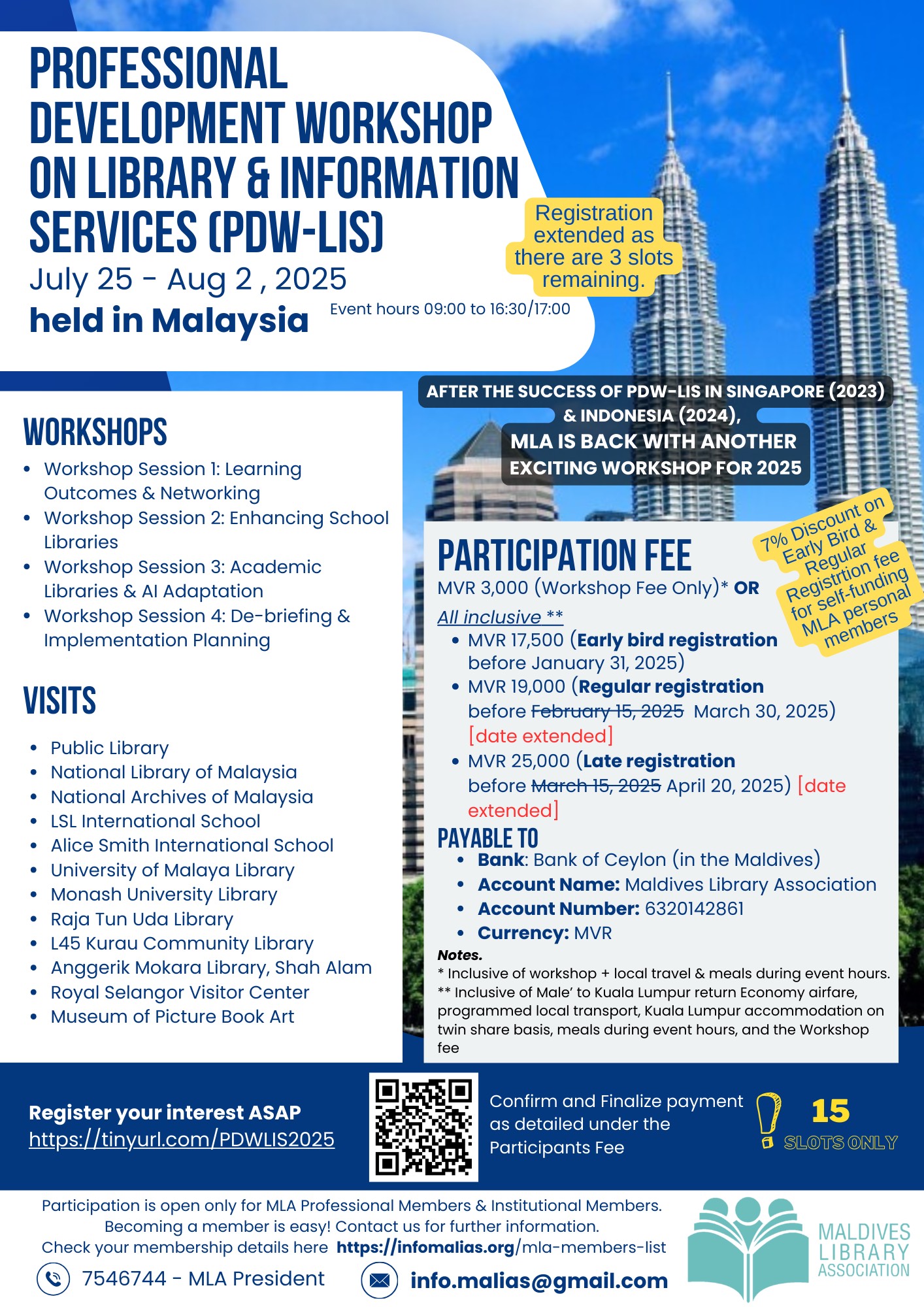 - All-inclusive Package: Covers airfare (Male’ to Kuala Lumpur return), local transport, accommodation (twin share basis), meals, and the workshop fee.